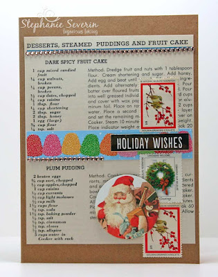 Stephanie says, "I had so much fun with my glue-as-I-go collage last week, I made another one. This time I started with a page from a vintage Pressure Cooker Recipe book. I added some gum drops and vintage stamps before finishing with a vintage Santa, some champagne gems and a metallic sticker sentiment."