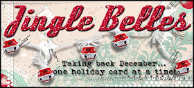 Lauren says, "i may have gone a little crazy with the inspirations this time! i used the color palette, obviously, and the fabulous (though slightly hidden) memory box jingle bell die that miss lorraine gave me for xmas (thank you!); and then i've also got the grungy vibe of the header working with some messy stenciled snowflakes and dots, plus i've got red glitter chipboard (of course, lol!) and i went a bit vintage and collagey with a lot of little fanciful layers, just the same way i did-- digitally-- making the header."