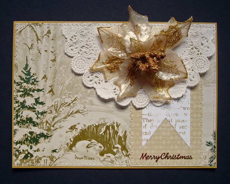 Lauren says, "If I could only have *ONE* source of vintage holiday images, I think I'd choose the stack of 1960's Christmas Ideals magazines that my uncle's mother, Georgia, lovingly saved for many years, and which he gave to me after she passed away. This pretty nature scene was actually the off-cut from an image i used a while ago, but the sweet little rabbits were just too cute to toss away. My layout is based on Sweet Sunday Sketch #173 which would be brilliant in any case, but was especially useful here, in allowing my strategically placed doily to cover a hole at the top of the image!"