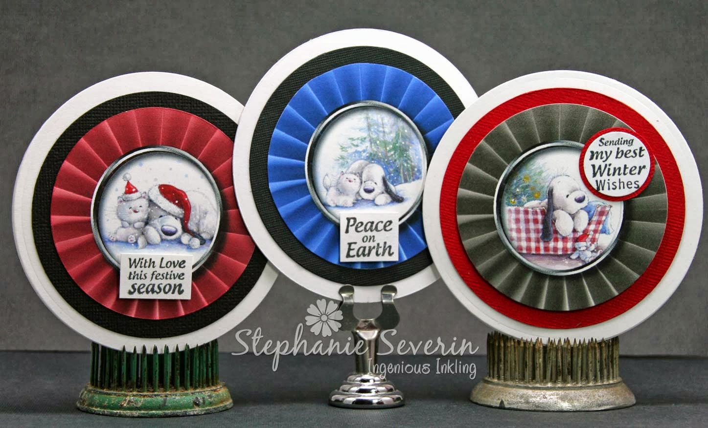 Stephanie says, "I gave my circle die cuts a workout this week. The cute little medallions are from the Barkley Christmas Papercrafting CD-ROM. I then used the next two larger die cuts for my mat and card base. I finished with perfectly sized tiny sentiments from the Jingle Bells Sentimentals set. The finished card are about 4", so they will be perfect to attach to wrapped gifts or tuck into gift bags. You can click through to my blog to see close-up pictures of each one."