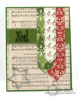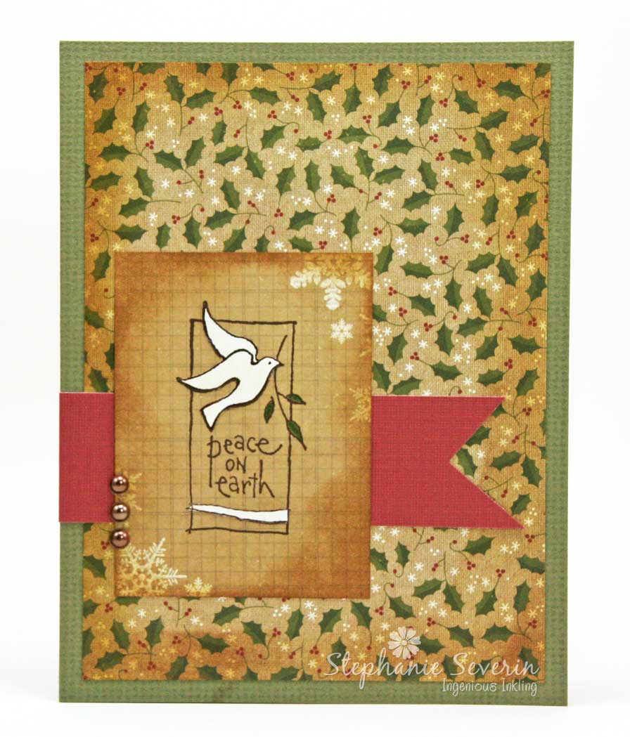 Stephanie says, "Peace stamps are my favorite for the holidays, so I decided to use the dove from Peace Window by Stampendous. I stamped it once in dark brown on the kraft journaling card & a second time on a piece of ivory designer paper to paper piece the dove & stripe on the image. Papers are from Simple Stories Handmade Holiday & the layout is from Sketch Saturday."