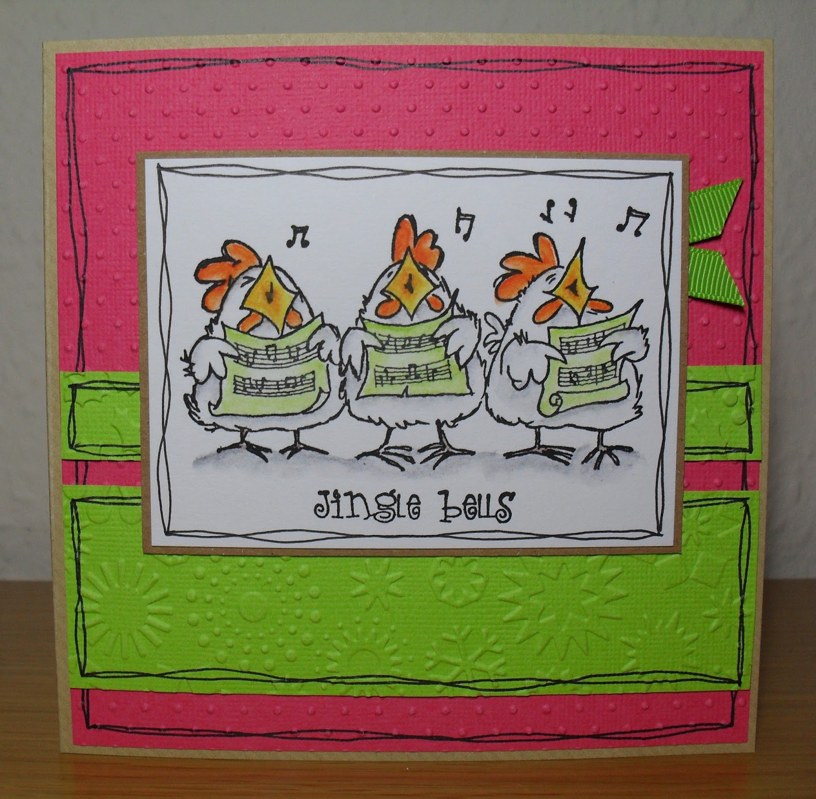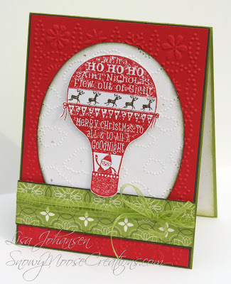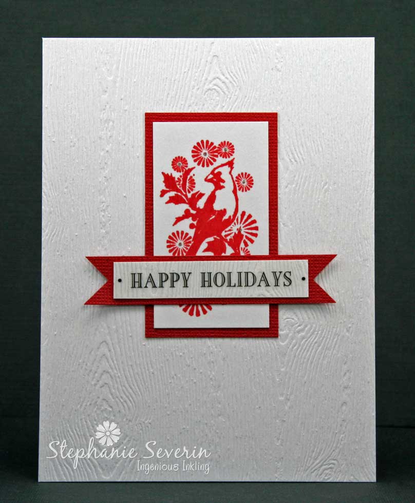 Lauren says, "As in all things, I concur with Stephanie: sometimes-- for all of us-- simple really *IS* best; thus this week I decided to do a Christmassy CASE of a birthday card I made last year for a ribbon challenge at Shopping Our Stash. This simple design let me use FOUR of my favorite holiday ribbons... two of which were scraps! Hard to beat that for convenience, right?! A few embellishments later, and I was one card closer to my third stress-free December!"