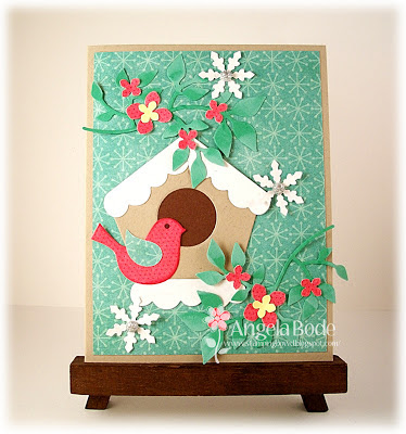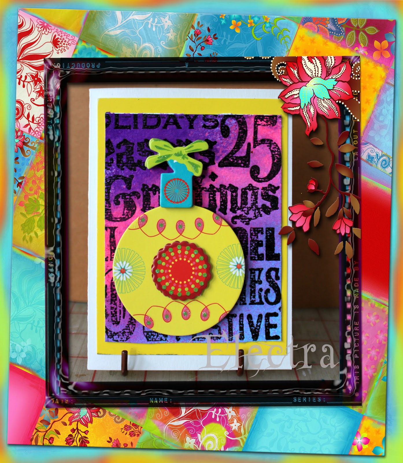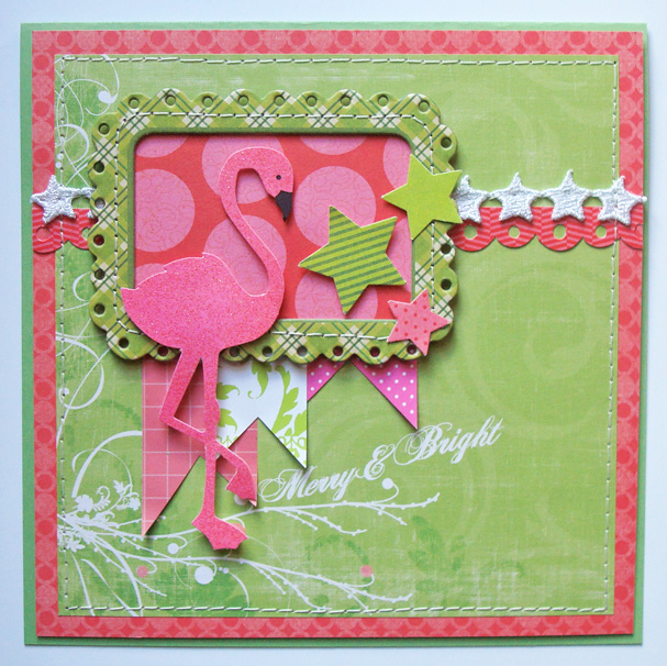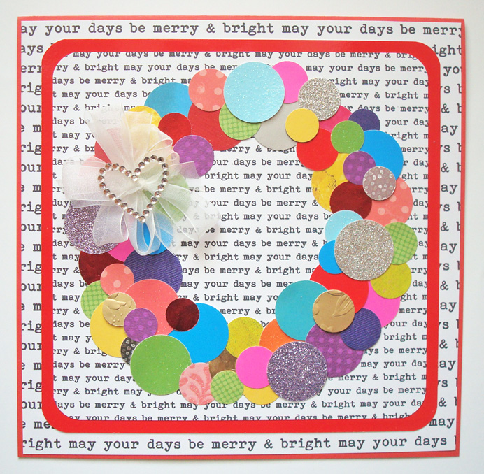 Stephanie says, "I started with this amazing vintage holiday card from my stash that I trimmed down slightly ... I thought a simple wrap of ribbon was the perfect accent to bring out the vibrant pink in the top bell ... sometimes for me, simple is best."