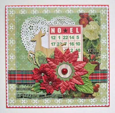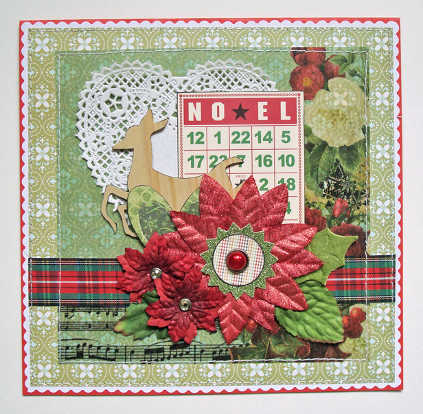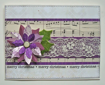 Lauren says, "I constructed my card using scraps, which just happened to look better on the horizontal than the vertical, so I took Allison's gorgeous sketch and went W*I*D*E with it! The diecut poinsettias were also leftovers, so I let them dictate my choice of accent colors. a little vintage sheet music, a scrap of lace, some machine stitching to make sure ALL the layers stay put... et voila!"