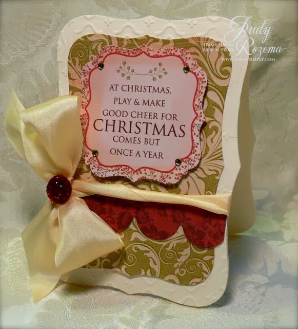 made this elegant holiday design featuring flourishes, embossing and ivory silk ribbon.
