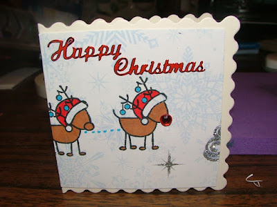 Stephanie says, "I went with the line straight across the top ... Santa, Bling & Stamping. I stamped three different Tim Holtz Santas using a combination of Fired Brick, Festive Berry and Gathered Twigs Distress Ink. I added circles of bling to highlight the Santa face in each design. The layout is this week's Sweet Sunday Sketch."