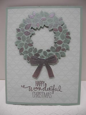 Kathe says, "I made this card using tissue wrap from a Christmas gift given to me by a friend in 2014. I used the same tissue for a card I made in January 2015, and I remembered to send the card to the friend who gave the original gift. This year I added a snowflake medallion cut from a Christmas card; I think it was one of the business-to-business cards I brought home from work."