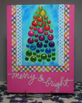 Stephanie says, "With the repeating circles in the design, I decided to make holiday ornaments my focal point. I built my card around the glittery ornament gift tag using papers from four different collections (including glittery green from some Halloween papers). I finished with sticker sentiments & sequins."
